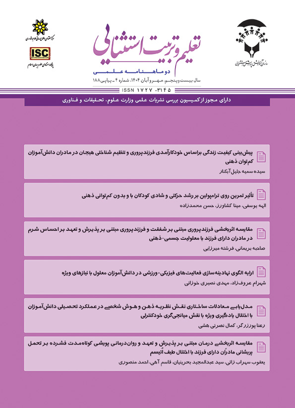 یکصد و هشتاد و هشتمین شماره نشریه تعلیم و تربیت استثنایی که مربوط به ماههای مهر و آبان سال 1404 میباشد با مقالاتی درخصوص؛ خودکارآمدی فرزندپروری و تنظیم شناختی هیجان در مادران دانشآموزان کمتوان ذهنی، رشد حرکتی و شادی کودکان با و بدون کمتوانی ذهنی با تمرین بر روی ترامپولین، فرزندپروری مبتنی بر شفقت و فرزندپروری مبتنی بر پذیرش و تعهد بر احساس شرم در مادران دارای فرزند با معلولیت جسمی- ذهنی و مقایسه اثربخشی آنها، نهادینهسازی فعالیتهای فیزیکی- ورزشی در دانشآموزان معلول با نیازهای ویژه، مدلیابی معادلات ساختاری نقش نظریه ذهن و هوش شخصی در عملکرد تحصیلی دانشآموزان با اختلال یادگیری ویژه با نقش میانجیگری، و اثربخشی درمان مبتنی بر پذیرش و تعهد و رواندرمانی پویشی کوتاهمدت فشرده بر تحمل پریشانی مادران دارای فرزند با اختلال طیف اتیسم و مقایسه آنها، منتشر شد.