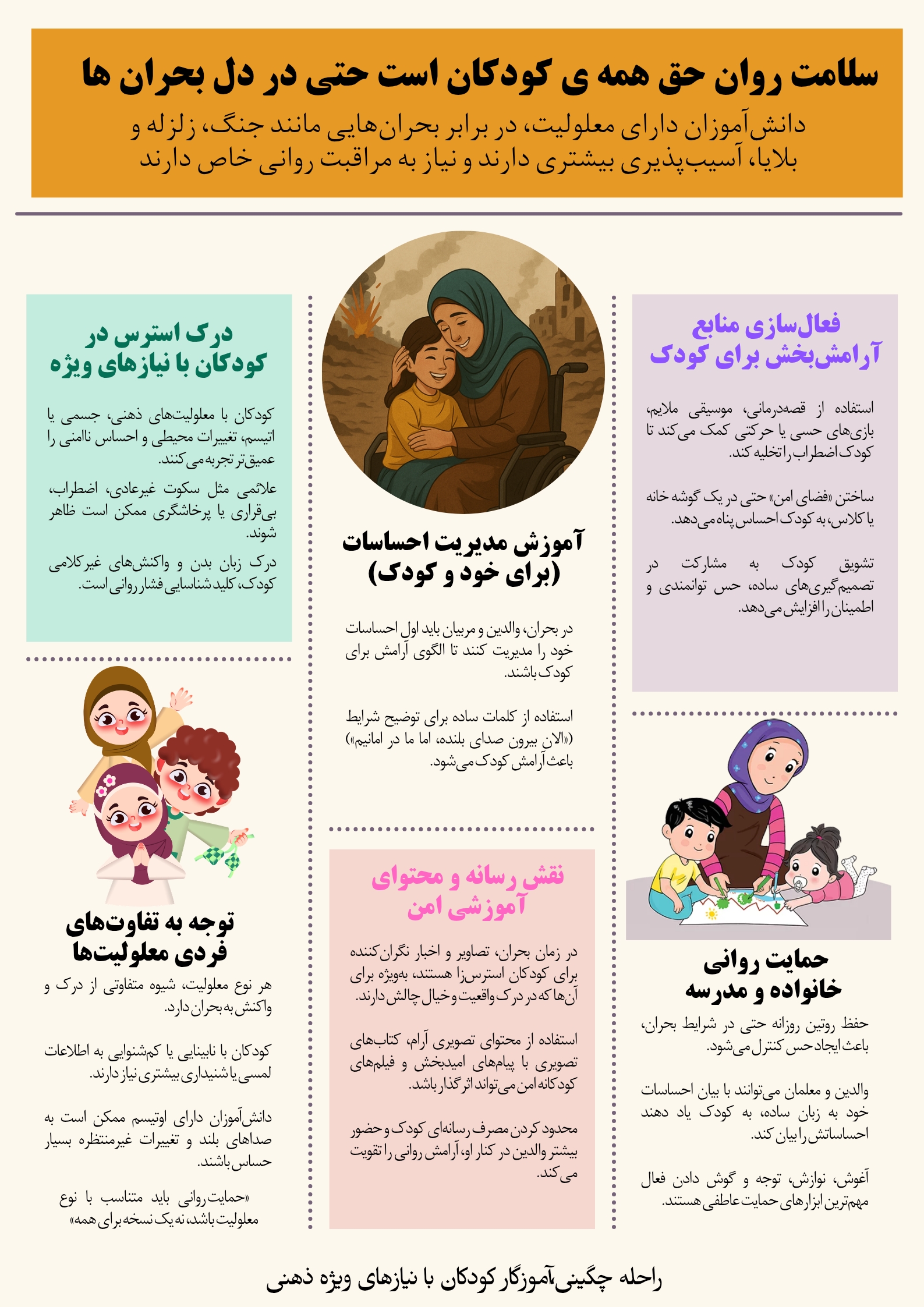 گفتنی است محورهای پیشنهادی برای ارسال آثار: سلامت روان دانش آموزان با معلولیت های مختلف در بحران (جنگ، بلایا، استرس جمعی)، تقویت جسم و ذهن دانش آموزان با معلولیت های مختلف (ورزش، تغذیه، خودمراقبتی)، تابآوری خانوادهمحور در بحران جنگ و بلایا (نقش والدین در حمایت دانش آموزان با معلولیت های مختلف)، خودباوری و مهارتآموزی در بحران جنگ و بلایا (نقش اولیاء مدرسه و معلم با تأکید بر انواع معلولیتها) میباشد. لازم به ذکر است که مهلت ارسال آثار تا بیستم تیرماه ۱۴۰۴ میباشد و آثار تولید شده با نام همکار و استان در کانال ها و گروه های پرورشی سازمان انتشار مییابد.